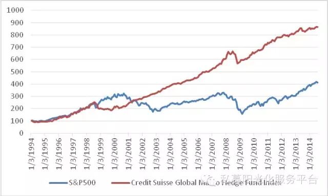 图表 1: 1994~2014瑞士信贷基金指数与标普500指数对比